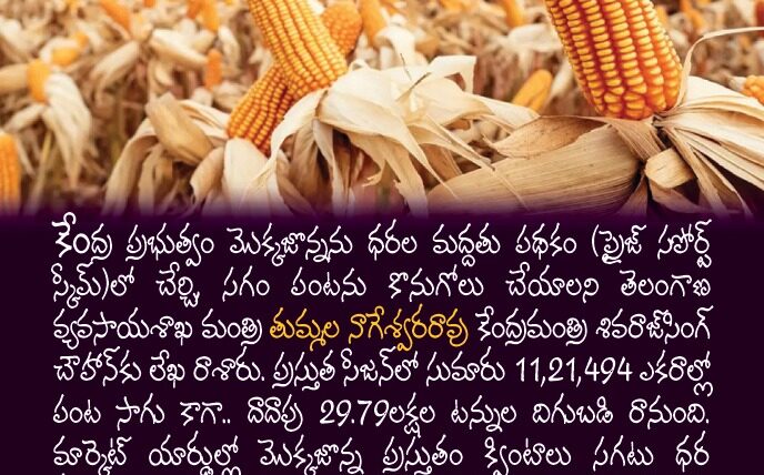 కేంద్ర ప్రభుత్వం మొక్కజొన్నను ధరల మద్దతు పథకం (ప్రైజ్ సపోర్ట్ స్కీమ్)లో చేర్చి, సగం పంటను కొనుగోలు చేయాలని తెలంగాణ వ్యవసాయశాఖ మంత్రి తుమ్మల నాగేశ్వరరావు కేంద్రమంత్రి శివరాజ్సింగ్ చౌహాన్కు సోమవారం లేఖ రాశారు. ప్రస్తుత సీజన్లో సుమారు 11,21,494 ఎకరాల్లో పంట సాగు కాగా.. దాదాపు 29.79లక్షల టన్నుల దిగుబడి రానుంది. మార్కెట్ యార్డుల్లో మొక్కజొన్న ప్రస్తుతం క్వింటాలు సగటు ధర రూ.1,759 పలుకుతుండగా.. కేంద్రం ప్రకటించిన కనీస మద్దతు ధర రూ.2,400తో పోలిస్తే ఇది రూ. 641 తక్కువ. రైతులను ఆదుకునేలా రాష్ట్ర ప్రభుత్వం 92 కొనుగోలు కేంద్రాలు ప్రారంభించి ఇప్పటివరకు 65వేల టన్నులు కొనుగోలు చేసింది. మార్కెట్లో అనిశ్చితి వల్ల ధరలు పడిపోయి రైతులు ఇబ్బందులు పడుతున్నారు. మొక్కజొన్నను పీఎసఎస్ కింద చేర్చి, మొత్తం ఉత్పత్తిలో 50% కేంద్ర నోడల్ ఏజెన్సీల ద్వారా కొనుగోలు చేసి రైతులను ఆదుకోవాలి” అని విజ్ఞప్తి చేశారు.