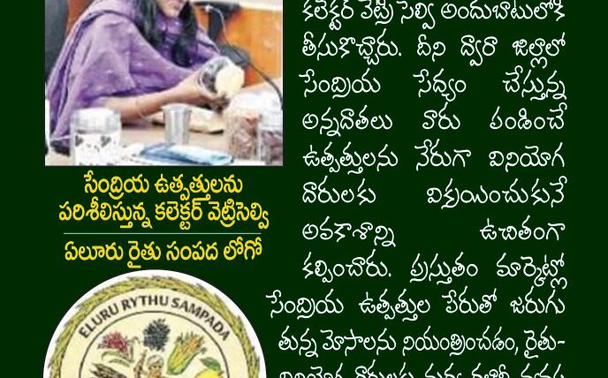 ‘ఏలూరు రైతు సంపద’ డాట్ ఇన్ అనే ఒక వెబ్సైట్ను ఏలూరు కలెక్టర్ వెట్రి సెల్వి అందుబాటులోకి తీసుకొచ్చారు. దీని ద్వారా జిల్లాలో సేంద్రియ సేద్యం చేస్తున్న అన్నదాతలు వారు పండించే ఉత్పత్తులను నేరుగా వినియోగదారులకు విక్రయించుకునే అవకాశాన్ని ఉచితంగా కల్పించారు. ప్రస్తుతం మార్కెట్లో సేంద్రియ ఉత్పత్తుల పేరుతో జరుగుతున్న మోసాలను నియంత్రించడం, రైతు-వినియోగదారులకు మధ్య దళారీ వ్యవస్థ లేకుండా ఉంచేందుకు ఈ ప్రత్యేక ప్లాట్ఫాంను కలెక్టర్ ఏర్పాటు చేయించారు. వెబ్సైట్లో అప్లోడ్ అయ్యే ఉత్పత్తులను జిల్లా వ్యవసాయ-ఉద్యానశాఖలు ధ్రువీకరిస్తాయి. దాంతో వినియోగదారులు నేరుగా పోర్టల్లోకి వెళ్లి కావాల్సిన ఉత్పత్తులను ఎంపిక చేసుకుని రైతులతో మాట్లాడి తీసుకోవచ్చు. సృజనాత్మక ఆలోచనలో భాగంగా…